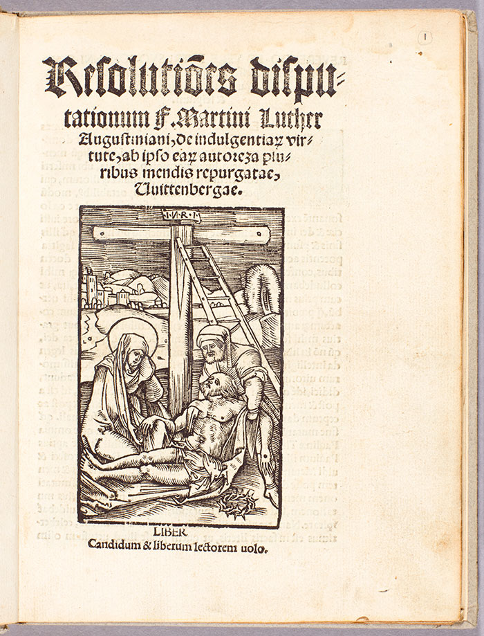The title page of Disputatio pro declaration virtutis indulgentiarum (Disputation on the Power of Indulgences) by Martin Luther (1483–1546), 1519. The original document of the “Ninety-five Theses” has not survived, but versions of it were published almost immediately by printers across Europe. Luther wrote his tract in Latin, the language of the Church, which suggests that he had clerics in mind and never suspected his arguments would reach a popular audience. This volume was printed in Leipzig, some 45 miles away from Wittenberg, where Luther lived. It is the earliest version of the “Ninety-five Theses” in The Huntington’s collection. The title page’s illustration depicts Christ’s deposition from the cross. The Huntington Library, Art Collections, and Botanical Gardens.