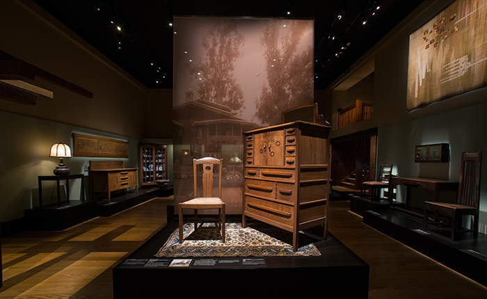 The newly installed permanent exhibition of Greene & Greene architecture and design in the Dorothy Collis Brown Wing. A black walnut and ebony chiffonier and matching chair from the master bedroom of the 1908 Gamble House take center stage.