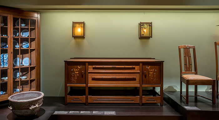 The sideboard and side chair from the 1909 Thorsen house in Berkeley, Calif. with above them two wall lanterns made for the 1902 James A. Culbertson house.