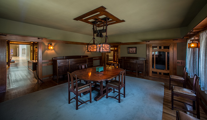Objects new to the installation include a dining room side chair from the Bolton house and a dazzling fire-screen from the Thorsen house made of steel and with repoussé detailing. An object prized both for its beauty and its provenance is a corner cabinet with glass panels that Charles Greene designed for his own house. It is filled with items from his collection of Japanese Imari ceramic ware.