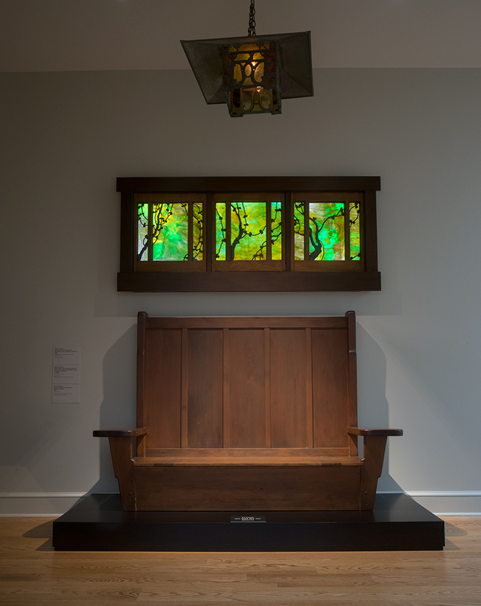 Curators are pleased about the reworked entrance to the installation. The recent reconfiguration of the American galleries created a long, wide hallway that visually and physically connects the Greene & Greene exhibition in the Dorothy Collis Brown Wing at one end with the Susan and Stephen Chandler Wing at the other. (Be sure to visit the Chandler Wing to see the exhibition “Yasuhiro Ishimoto: Bilingual Photography and the Architecture of Greene & Greene.”) You now enter the Greene & Greene exhibition through a foyer space made up of a bench built for the Freeman Ford house, a lantern from the front entry porch of the Jennie Reeve house, and three of five casement windows from the Adelaide Tichenor house. The once hidden Greene & Greene collection is now hard to miss.