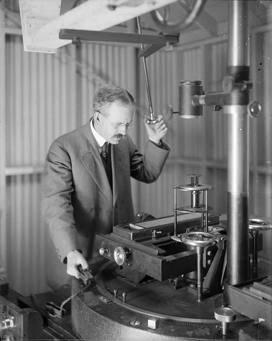 George Ellery Hale, renowned solar astronomer, at the spectrograph of the 60-foot solar tower telescope, Mount Wilson Observatory, ca. 1908. The Observatories of the Carnegie Institution for Science Collection at the Huntington Library, San Marino, Calif.