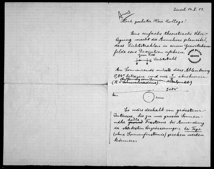 Letter from Albert Einstein to George Ellery Hale, Oct. 14, 1913. In this letter, Einstein asks Hale, director of the Mount Wilson Observatory, whether it would be possible to measure starlight bending around the sun during the day. The Observatories of the Carnegie Institution for Science Collection at the Huntington Library, San Marino, Calif.