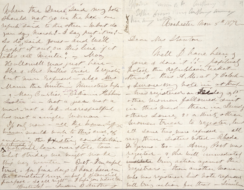 Susan B. Anthony (1820–1906), letter to Elizabeth Cady Stanton, Rochester, N.Y., Nov. 5, 1872. The letter begins on the right side of a creased sheet of paper and continues on the opposite side before ending on the left side of the sheet above. The Huntington Library, Art Collections, and Botanical Gardens.