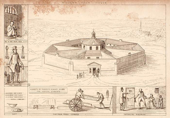 The windowless octagonal Modern Poor House sits isolated on the outskirts of town. Debtors and paupers are whipped and then chained and imprisoned in solitary confinement. Their diet is composed of bread and gruel. Detail from Augustus Welby Northmore Pugin’s “Contrasted Residences for the Poor: Modern Poor House; Ancient Poor House” in Contrasts, or, A parallel between the noble edifices of the Middle Ages, and corresponding buildings of the present day, shewing the present decay of taste, 1841. The Huntington Library, Art Collections, and Botanical Gardens.