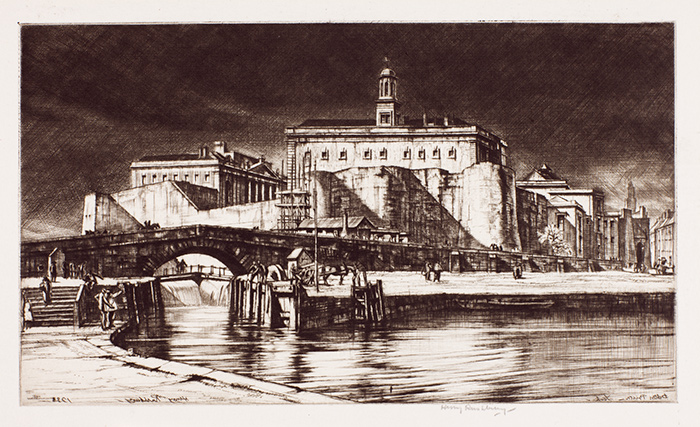 Similarly, Henry Rushbury’s etching Debtor’s Prison, York shows how the 18th-century prison (constructed 1701–1705) rises above a thick outer fortress wall of an 11th-century castle built by William the Conqueror, providing a towering reminder of the punitive consequences for persons failing to pay their bills.