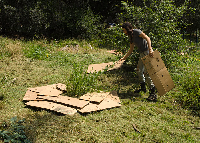Ranch apprentice Ellen Herra arranges sheets of overlapping cardboard as the first step in sheet mulching. Photo by Lisa Blackburn.
