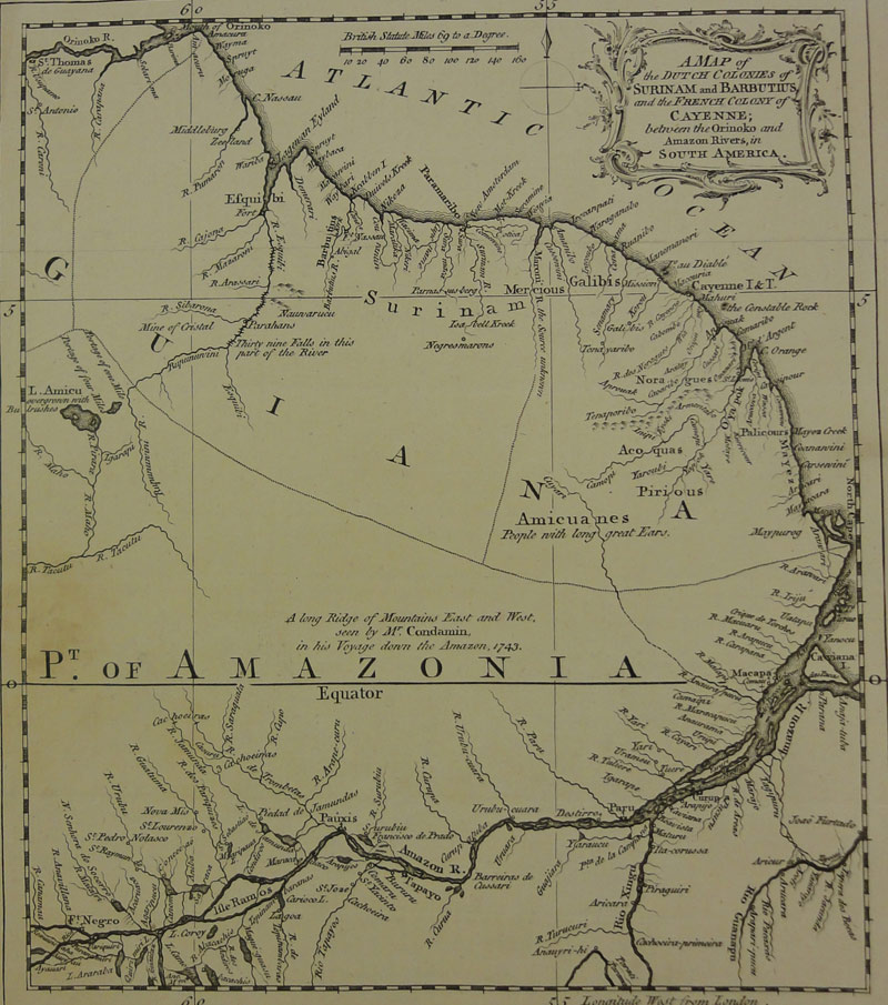 From the Huntington's collections, a map—“A Match of the Dutch Colonies,” from London Magazine, c. 1763—showing what is one of the first instances of the use of “Amazonia” to refer to this space.