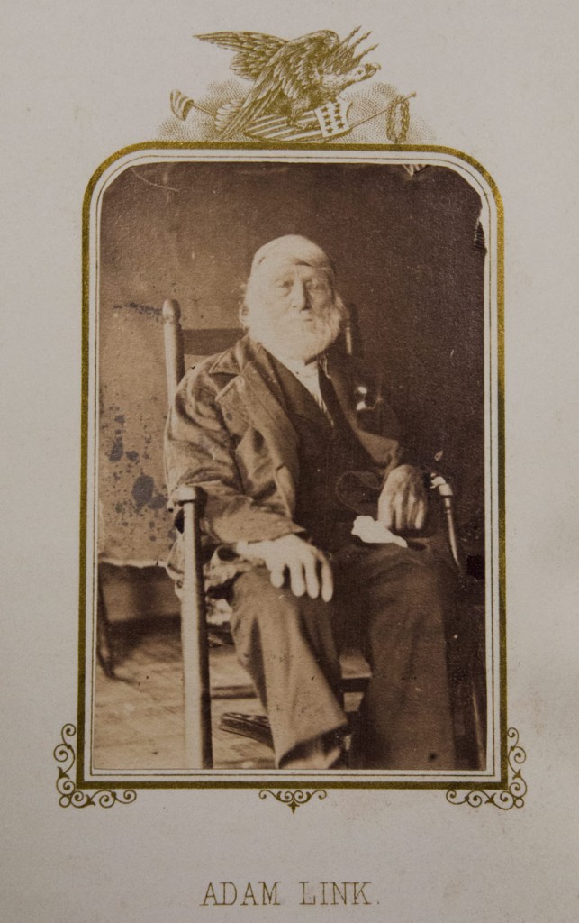 Adam Link. Albumen carte-de-visite print; 3 ¼ x 2 ¼ in. From E. B. Hillard, The Last Men of the Revolution: A photograph of each from life, together with views of their homes printed in colors. Hartford: N. A. & R. A. Moore, 1864 (RB 96906).