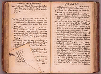 Copy of A Catalogue of Chymicall Books, by William Cooper (1675), from the personal library of Isaac Newton, who folded pages of interest in many of his books. Huntington Library, Art Collections, and Botanical Gardens.