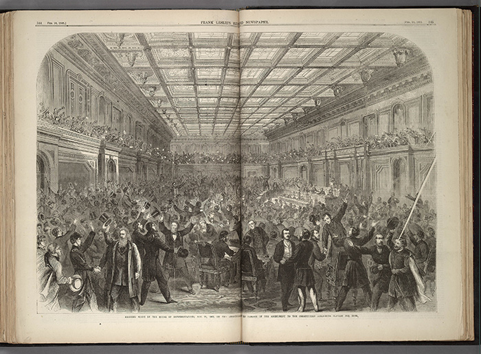Scene in the House of Representatives on Jan. 31, 1865. From Frank Leslie’s Illustrated Newspaper, Feb. 8, 1865. The Huntington Library, Art Collections, and Botanical Gardens.