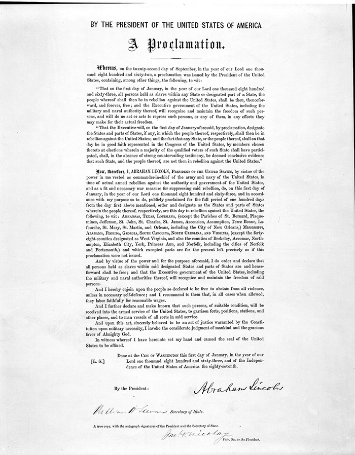 In his constitutional power as commander-in-chief of the armed forces, Lincoln issued the Emancipation Proclamation on Jan. 1, 1863. It declared “that all persons held as slaves” within the rebellious states “are, and henceforward shall be free.”