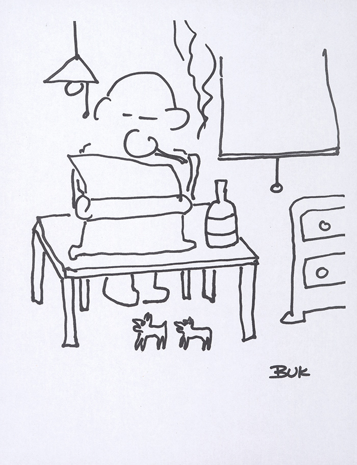 “All I need now is what I needed then: a desk lamp, the typer, the bottle, the radio, classical music, and this room on fire.” From “I am a Mole.” Self-portrait by Charles Bukowski. Undated. From the collection of Linda Lee Bukowski.