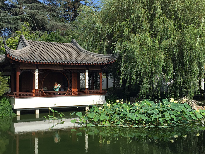 This excerpt comes from Zhou’s famous essay titled “On the Love of the Lotus” (Ai Lian Shuo), which inspired the name of the Chinese Garden’s Love for the Lotus Pavilion (Ai Lian Xie). Situated at the lake’s edge, the pavilion provides a perfect viewpoint for observing lotus blooms. Visitors can take it all in: the fabulous flowers, colorful carp, and blissful serenity.