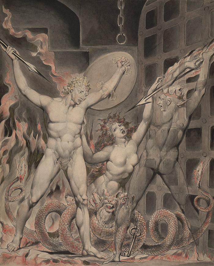 William Blake shared Fuseli’s passion for fantastic, supernatural themes, like this c. 1806 pen and watercolor Satan, Sin, and Death: Satan Comes to the Gates of Hell. The Huntington Library, Art Collections, and Botanical Gardens.