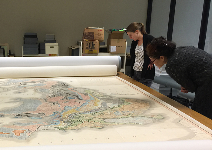 The Claremont Colleges Library’s copy of William Smith’s map, A Delineation of the Strata of England and Wales, published in 1815, at the Honnold-Mudd Library in Claremont. This map will be on display in a classroom adjacent to Rothenberg Hall for half an hour before and one hour after Simon Winchester's talk about William Smith on Dec. 8. Annie Wilker (left), senior paper conservator at The Huntington, and Lauren Tawa, exhibits manager at The Huntington, take a close look at the map. Photo by Holly Moore.