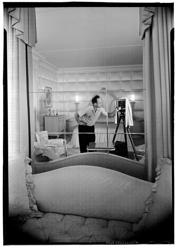 Maynard L. Parker at work in the bedroom of the Hilda Boldt Weber residence, Bel Air, Los Angeles, 1939. Architect: James E. Dolena; interior designer: T. H. Robsjohn-Gibbings. Film negative, 7 × 5 in. (17.8 × 12.7 cm).