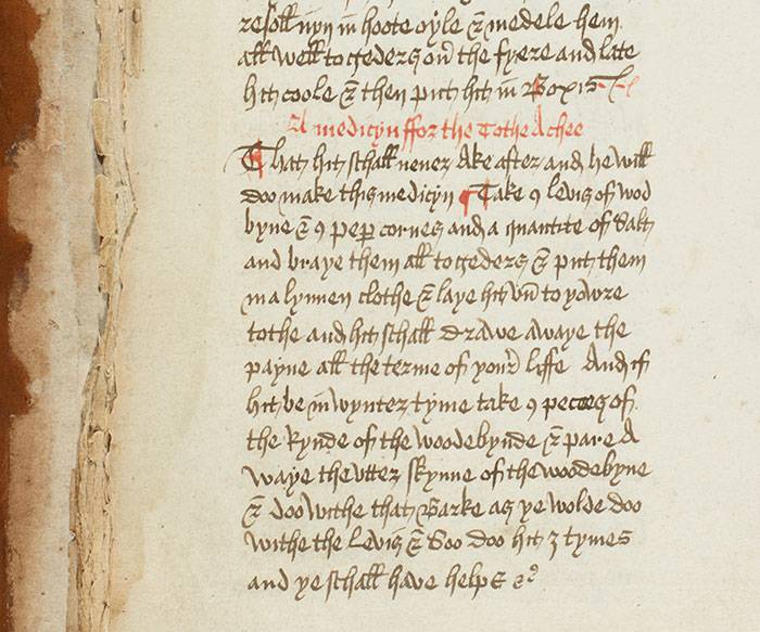 A medical recipe for toothache appears on this page (folio 24 verso). The Huntington Library, Art Collections, and Botanical Gardens.