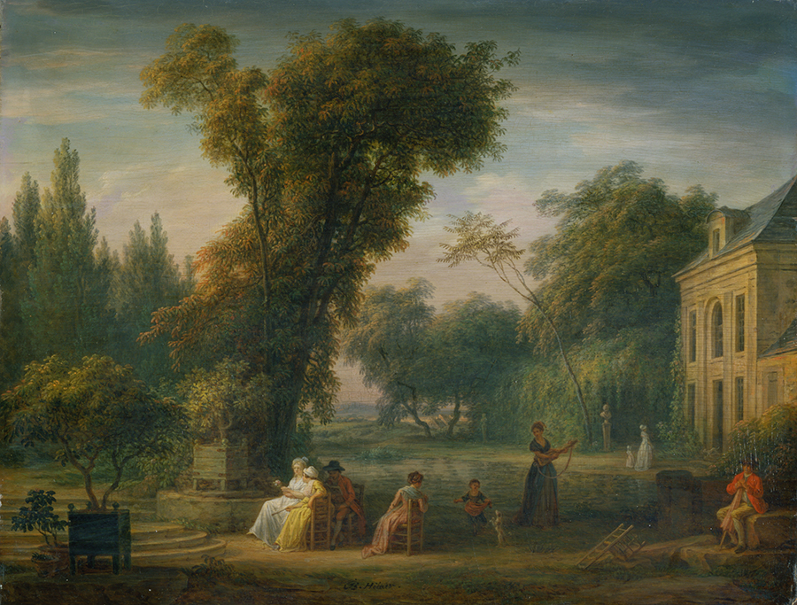 Dans le Jardin, ca. 1795, by Jean-Baptiste Hilair. Oil on panel, 12 3/8 x 16 1/8 in. (31.4 x 41 cm.). Adele S. Browning Memorial Collection, gift of Mildred Browning Green and Honorable Lucius Peyton Green. (This painting is on view on the second floor of the Huntington Art Gallery.) The Huntington Library, Art Collections, and Botanical Gardens.