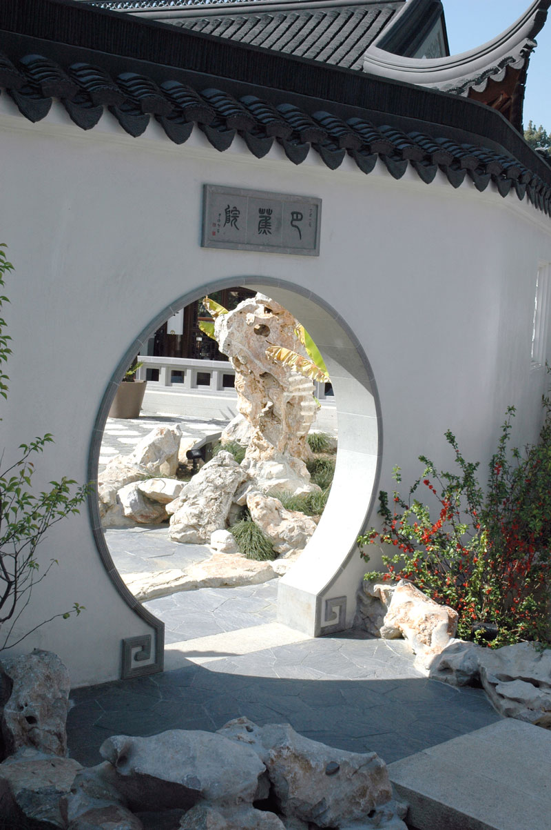 Peizhu Yu's calligraphy above the entrance to the Plantain Court of The Huntington's Chinese garden. Photo by Lisa Blackburn.