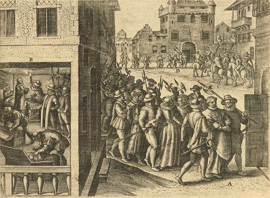 Evening raid, search, and arrest of an Elizabethan Catholic household by Protestant authorities, from Richard Verstegan, Theatrum crudelitum haereticorum nostri temporis (Antwerp, 1587). The Huntington Library, Art Museum, and Botanical Gardens.