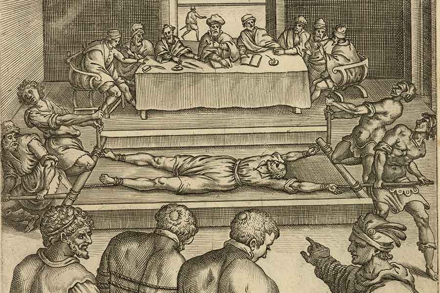 Jesuit priest and martyr, St. Edmund Campion, on the rack, with English scribes at the ready to record his confessions, from Ecclesiae Anglicanae trophaea (Rome, 1584). The Huntington Library, Art Museum, and Botanical Gardens.