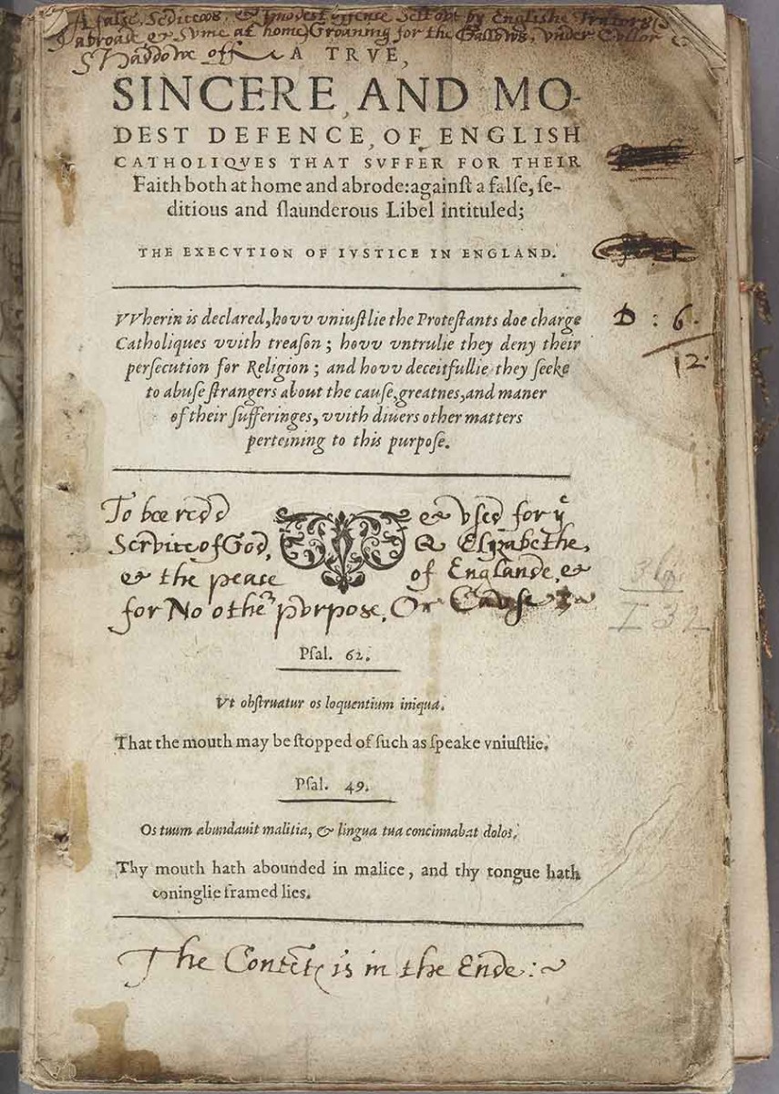 Title page of William Allen’s A true, sincere, and modest defence of English Catholiques (1584). An illicit Catholic book annotated by Richard Topcliffe, the infamous torturer of Elizabethan Catholics “Groaning for the Gallows,” with his further caveat: “To bee redd & vsed for ye Service of God, Q Elizabethe, & the peace of Englande, & for No other pvrpose, Or Cause.” The Huntington Library, Art Museum, and Botanical Gardens.