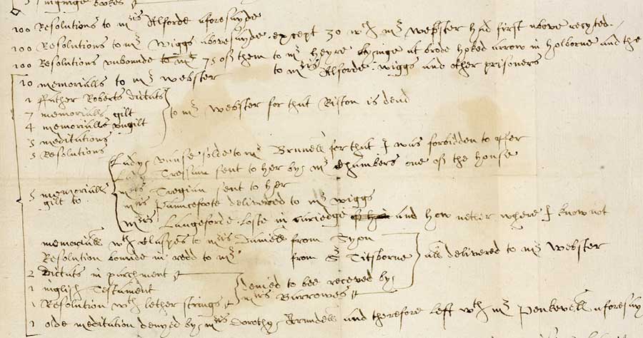 A December 1587 manuscript book smuggling inventory listing 614 illicit Catholic imprints and numerous named women book smugglers and intended recipients. Likely compiled in the Marshalsea Prison, this list was delivered to Joan Aldred, the wife of the Catholic spy Solomon Aldred, employed by Queen Elizabeth’s spymaster, Sir Francis Walsingham. British Library, Lansdowne MS 33/63.