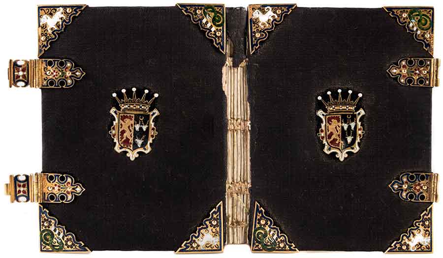 Scribal copy of the Catholic Manual of prayers (n.p., 1583), bound in black velvet and solid gold binding furniture, with champlevé enamel depicting the arms of the Catholic Gilbert and Mary Talbot, 7th Earl and Countess of Shrewsbury. Purchased by the Library Collectors’ Council. This book is on view in the exhibition "What Now: Collecting for the Library in the 21st Century, Part 1" in the West Hall of the Library through Feb. 17, 2020. The Huntington Library, Art Museum, and Botanical Gardens.