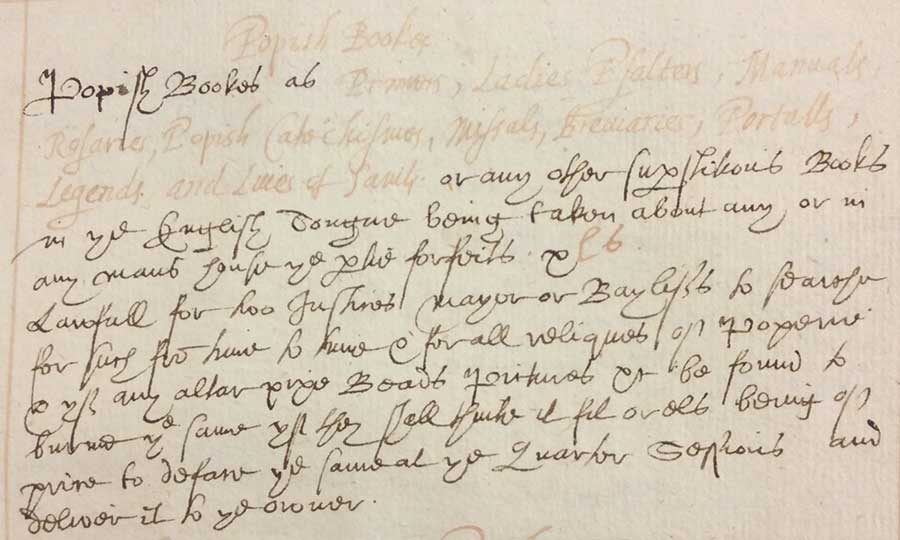 Less studied, however, is the material evidence of this historical community and its cultural practices, as they were preserved within the pages, bindings, and manuscript marginalia of books. The compilation and copying of these works, their underground printing, and their subsequent circulation and consumption by both lay Catholic readers and antagonistic crown officials—all warrant further exploration. A significant portion of this activity took place in the eminently adaptable (if also more time-consuming, work-intensive, and costly) realm of scribal production, well over a century after Gutenberg’s invention of printing by moveable type.
