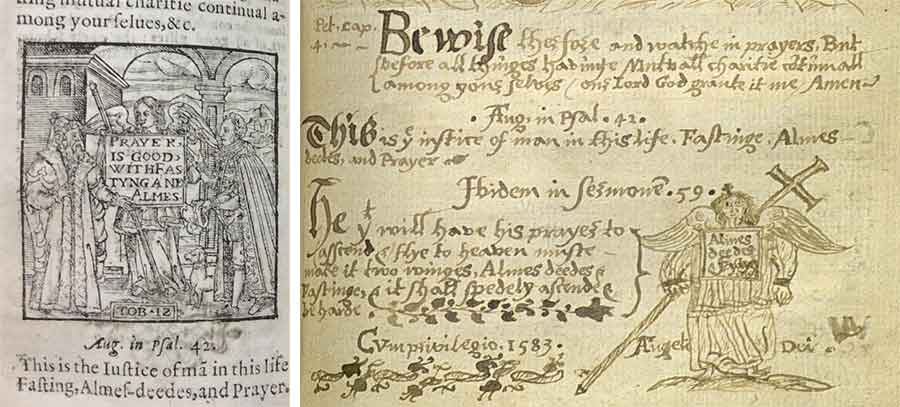 Left: A manual of prayers newly gathered out of many and diuerse famous authors (n.p., 1583), one of three extant copies, Gonville & Caius College Library, Cambridge University. Right: Elizabethan Catholic scribal adaptation of the same text and image. Oscott College Library.