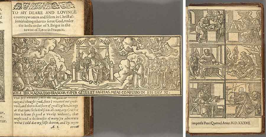 Left and right: Diego de Estella, The contempte of the world, and the vanitie thereof (Rouen, 1584), one of 13 known copies, this one uniquely extra-illustrated with woodcut engravings cut from an imprint issued from the Cologne press of Peter Quentell decades earlier in 1536. The Huntington Library, Art Museum, and Botanical Gardens.