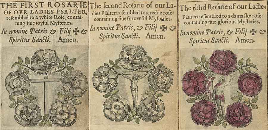 Three pages of The Rosarie of our Ladie. Otherwise called our Ladies Psalter (Antwerp, 1600). The first two engravings hand-colored subtly with green leaves and white roses, the third with additional brilliant red to reflect the “glorious” mysteries of the Resurrection of Christ. The Huntington Library, Art Museum, and Botanical Gardens.