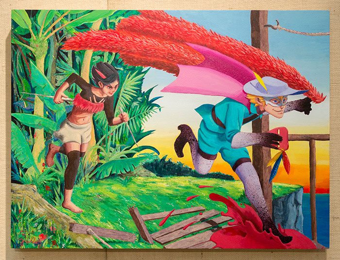 Hori says one of the most talked about works in the exhibition is Jairo Perez’s White Masked Ladrón, a painting that depicts a thief stealing a magnificent feathered cape—on view in the “Visual Voyages” exhibition—from the native people for whom it has sacred value. The thief leaves a trail of blood behind. Perez, in his artist’s statement, writes: “the theft of a culture . . . I feel that thought never went through the minds of the conquistadors; for them these relics were more of a status booster.”