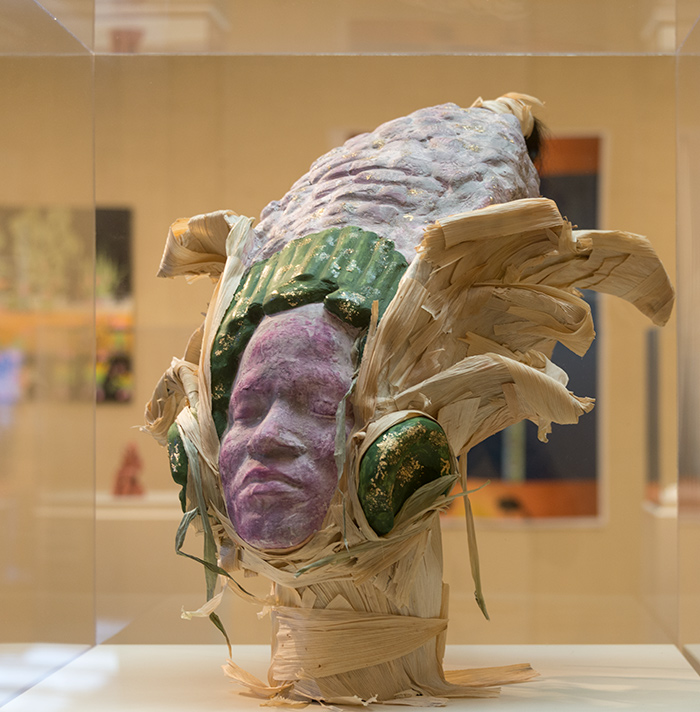 Luis Mateo, Hijo de Maíz, plaster sculpture, corn husk with human hair, 2017. The Mayan god of maize inspired this sculpture. Photo by Kate Lain.