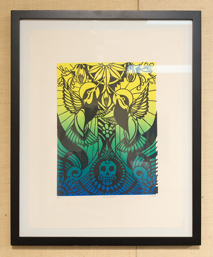 Victor Reyes, Mission of the Humming Bird, linoleum print on paper, 2017. Reyes’s print takes inspiration from a Quechauas legend. Photo by Kate Lain.