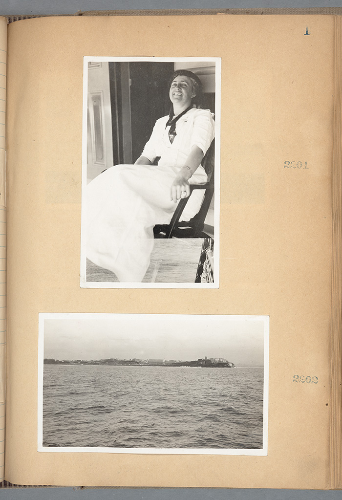 Ralph Arnold took these two photos in 1912 on a business trip to Puerto Rico. Above, his wife, Winninette Arnold, sits on what looks like a boat’s deck chair. Ralph Arnold wrote a caption for the photo below: “View of the fort at San Juan harbour, and San Juan City as viewed from the ocean.” The Huntington Library, Art Collections, and Botanical Gardens.