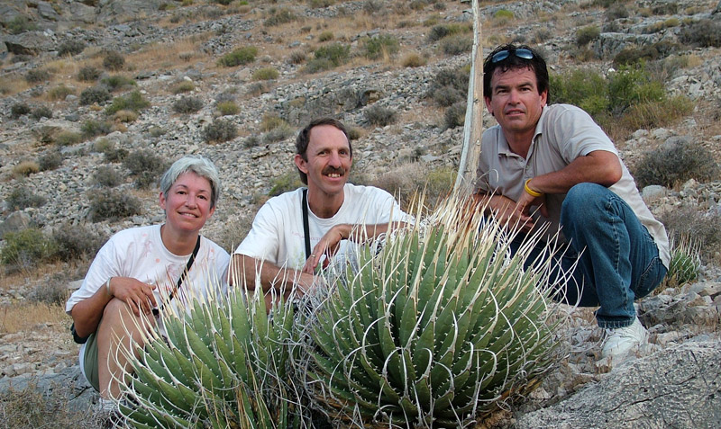 Karen Zimmerman, desert collections propagator, and John Trager, director of ISI, pose with agave specialist Kelly Griffin and the Agave utahensis var. eborispina. Seeds were collected from this specimen in the Nopah Mountains, near the California-Nevada border and made available in the 2009 catalog of International Succulent Introductions. Photo by Kelly Griffin.