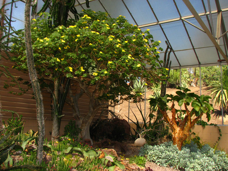 The large succulent (at left) in one corner of The Huntington’s Desert Conservatory is a specimen of Uncarina grandidieri, native to Madagascar. Next to it (at right) is Cyphostemma currori, a member of the grape family native to Namibia. Below that, is a ground cover called Senecio sempervivus, derived from a plant collected in Yemen back in 1967. Photo by John Trager.