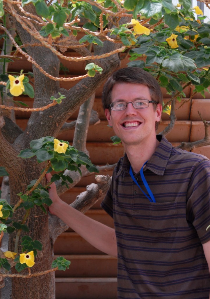 John Zaborsky, a graduate student in botany at the University of Wisconsin, poses next to the Uncarina grandidieriin the Desert Conservatory. Photo by Karen Zimmerman.
