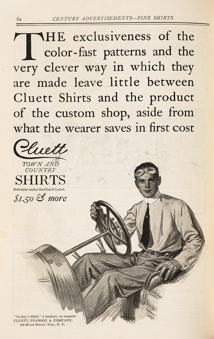 With awareness of and interest in automobiles percolating through the newspapers and magazines of the early 20th century, manufacturers of other products began relying upon the motor car to promote sales of their goods, as seen in this 1908 advertisement for Cluett Town and Country Shirts. The Huntington Library, Art Collections, and Botanical Gardens.