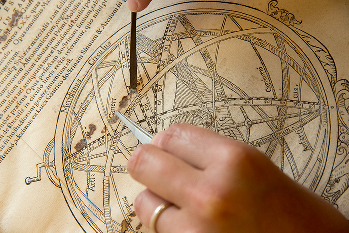 Kristi Westberg, the Dibner Book Conservator at The Huntington, works to preserve a copy of Primum mobile (Prime Mover), an astronomy book by the Austrian humanist and astronomer Erasmus Oswald Schreckenfuchs (1511–1579). Photo by Kate Lain.