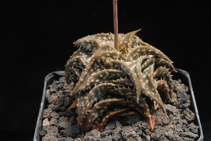 The leaves of Aloe descoingsii are arranged in miniature rosettes only two inches across and are notable for their small white markings and distinctive teeth. Photo by Karen Zimmerman.