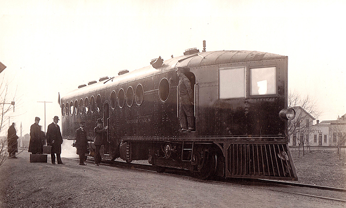 McKeen Motor Car, 1906. The sleek McKeen motor car, a gasoline-powered railway vehicle with innovative porthole windows and an aerodynamic “wind-splitter” front end, was the brainchild of engineer William R. McKeen Jr. (1869–1946). Unidentified photographer. The Huntington Library, Art Collections, and Botanical Gardens.
