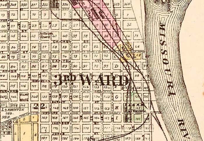 Detail of map of Omaha, Nebraska, 1887. This detail shows the vicinity of some of the brothels downtown by the railroad tracks and the river: “House of all Nations” at 9th and Dodge Street. (on map at the top of the second “R” in “3rd WARD”); “Mongrel House” at South 16th Street; and “Minnie Fairchild’s” at 120 South 9th St. (on 9th, just below Dodge Street). The Huntington Library, Art Collections, and Botanical Gardens.