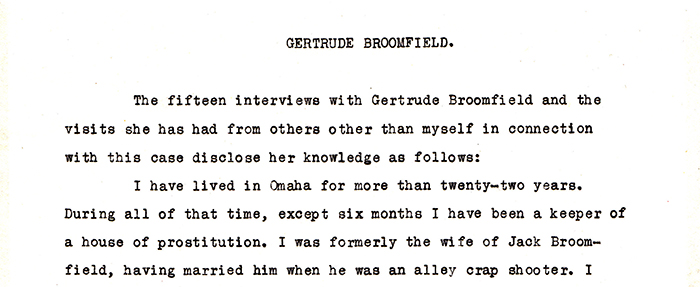 For instance, the account by brothel owner Gertrude Broomfield tells a little of her life history: “I have lived in Omaha for more than 22 years. During all that time, except six months I have been a keeper of a house of prostitution . . . and had as my patrons some of the best men in Omaha . . . .” She went on to explain how visiting brothels was often a family affair, as she counted among her clients “the young Hamilton boys, the Krug boys, the Metz boys, the Kountz boys . . . and hundreds of women and men you would little suspect of visiting that district.”