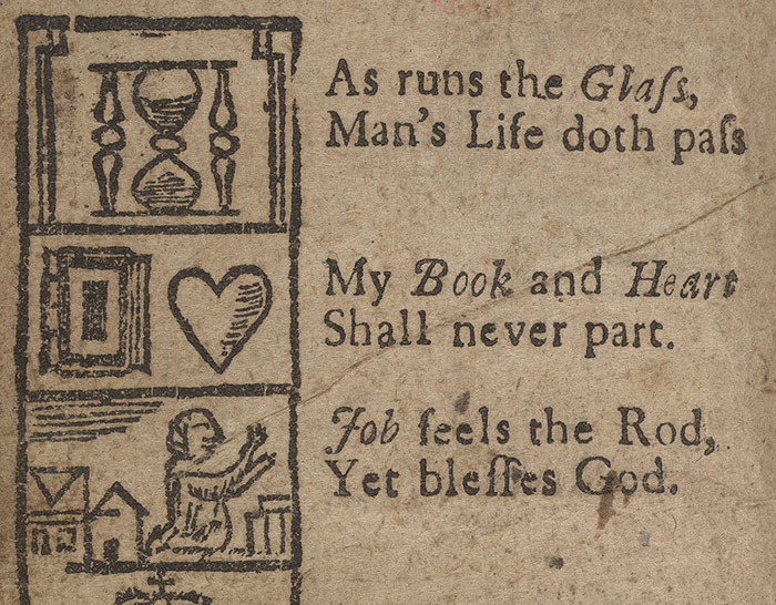 Instruction in religious affections began in childhood in the New England colonies. First advertised in 1690, The New-England Primer was a popular schoolbook for decades and it taught Puritan beliefs along with literacy. The picture alphabet offered memorable rhymes, including the central one above about the Bible and the heart. Detail from The New-England primer, enlarged: for the more easy attaining the true reading of English, 1735. The Huntington Library, Art Collections, and Botanical Gardens.