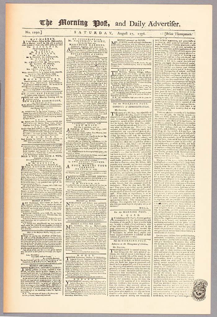 The Morning Post, and Daily Advertiser, No. 1190, August 17, 1776. London: Printed by R. Haswell. The Huntington Library, Art Collections, and Botanical Gardens.