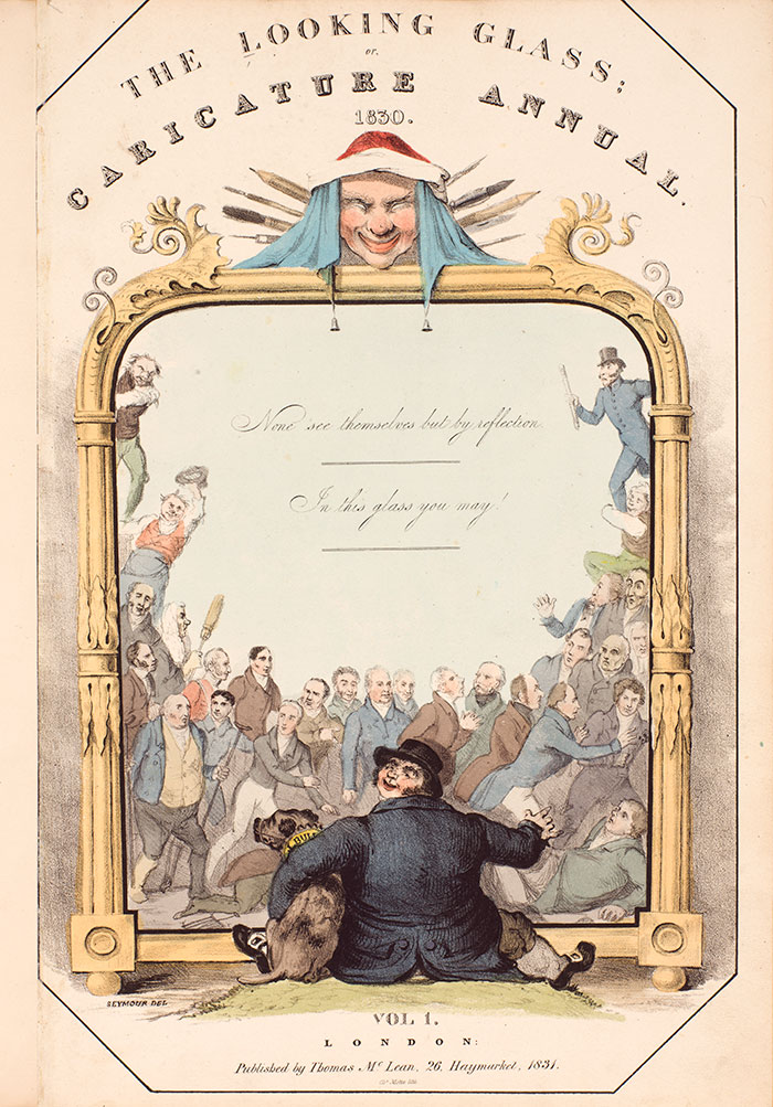 Robert Seymour, cover design for Volume One of The Looking Glass, 1830. Seymour depicts John Bull, the archetypal Englishman, turning his head to us and smiling gleefully at the rout of the Tory government by the jubilant Whigs (or Liberals). The Huntington Library, Art Collections, and Botanical Gardens.