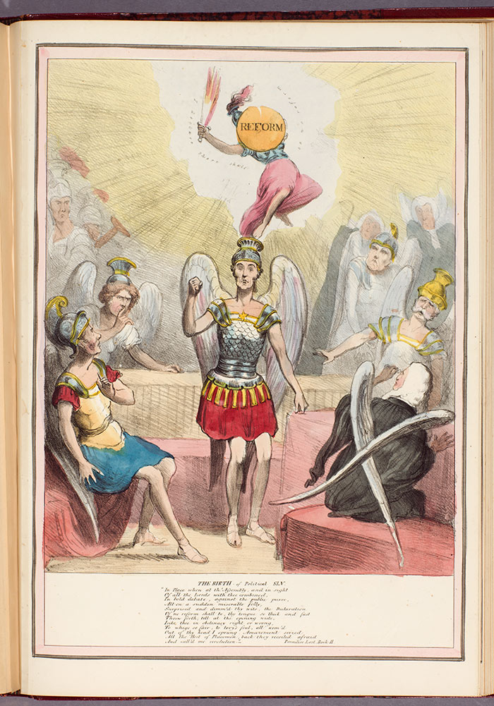 Robert Seymour, “The Birth of Political Sin,” The Looking Glass, Nov. 1831. Seymour shows the Duke of Wellington, the hero of Waterloo and the leader of the Tories, as a character from Greek myth. Titled “The Birth of Political Sin,” the scene re-enacts the creation of the goddess Pallas Athena from the head of Zeus. The joke is that Wellington’s stubborn resistance to change had turned public opinion in favor of reform, which he and his party had opposed. The Huntington Library, Art Collections, and Botanical Gardens.